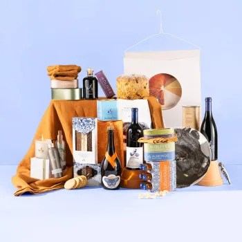 The extravagant blue gift box contains: A Laterite Tablecloth (3.5 m), Laterite Napkins (4-pack x 2), Bull Bowl, Sprankel 2017, Nebukadnesar 2021, Shiraz 2020, Bitterlekker (6-pack), Corkscrew, 2024 Calendar, Chocolate Twigs, Chocolate Boutique, Macadamias in Tin, Almonds in Tin, Kalamata & Caper Tapenade, Basil Pesto, Kalamata Olives in Brine , Nocellara Olives in brine, Birdsong Room Spray, Smeulende Fynbos Candle, Heuningbos Oil-based Wash, Panettone Traditional, Rooibos Tea Tin, Olive Oil Coratina, Balsamic Vinegar 3-year-old, Nostalgiese Koekieblik.