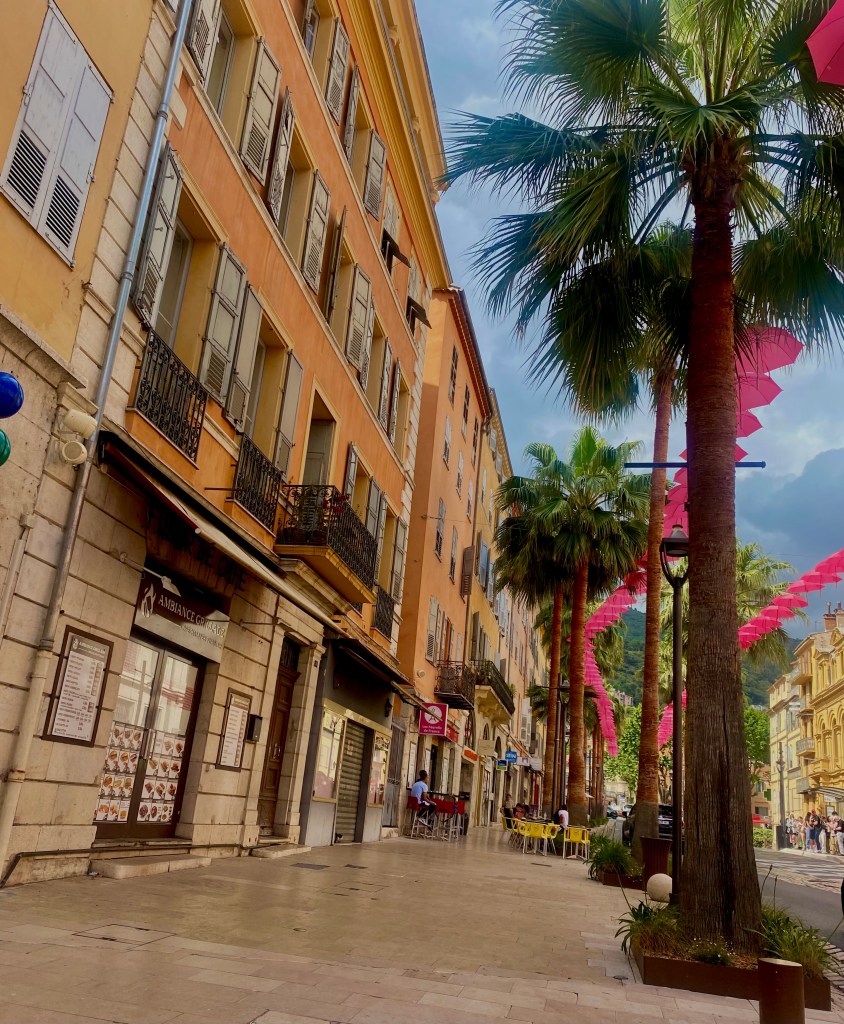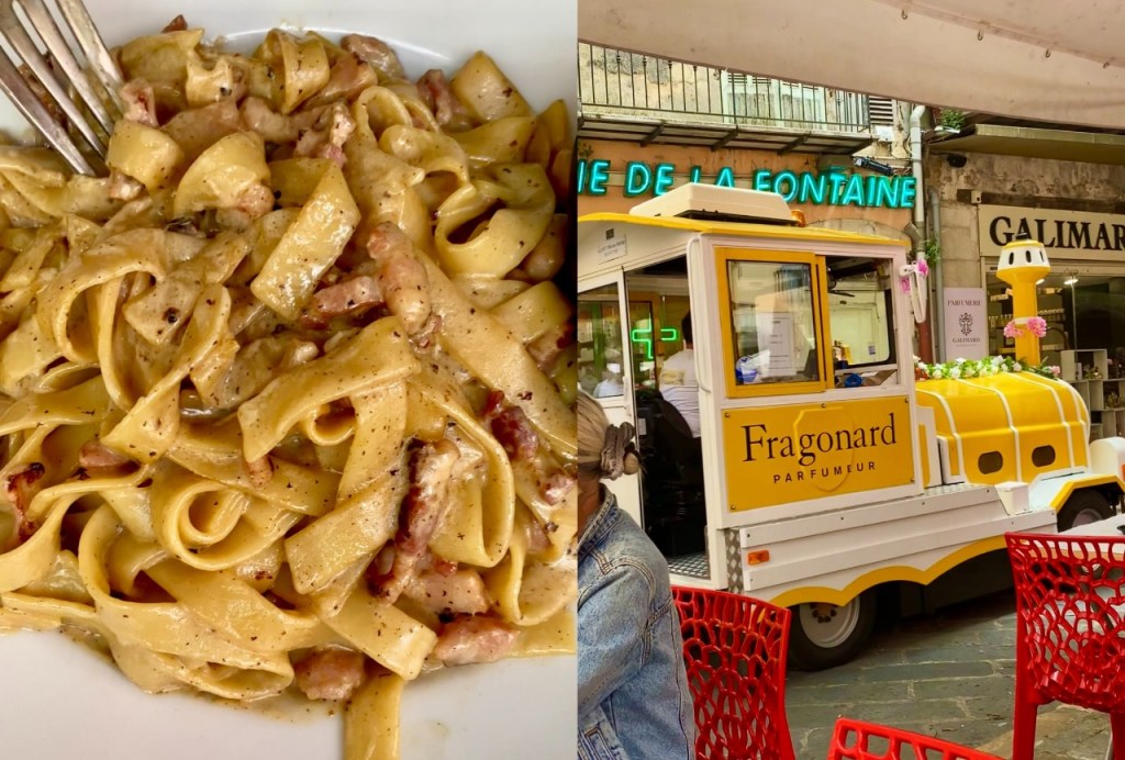 The best thing about the French Riveria is the food. After spending the day wandering about, we settled at a beautiful restaurant in what seemed to be the equivalent of an outside food court with restaurants sprawling in the middle, surrounded by local boutiques and pharmacies. A Fragonard Perfume Museum train routinely circled around the restaurants grouped in the middle of what may be considered the City Centre.